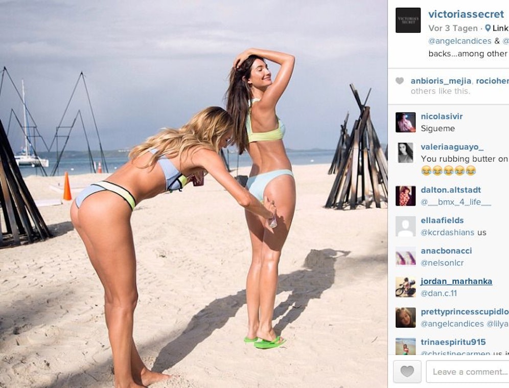 Teamspielerinnen. So schaut Arbeitsteilung bei den Engeln von "Victorias Secret" aus: Candice Swanepoel schmiert Lily Aldridge das Popscherl ein. instagram.com/victoriassecret