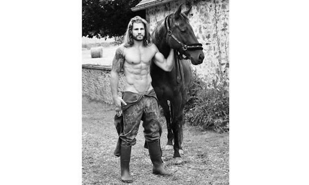 Pin-up. Schwierige Entscheidung, wen von den beiden wir prachtvoller finden: Das Pferd oder den halbnackte Bauern. Fotografiert wurden die Prachtexemplare für den "French Farmers Calendar".