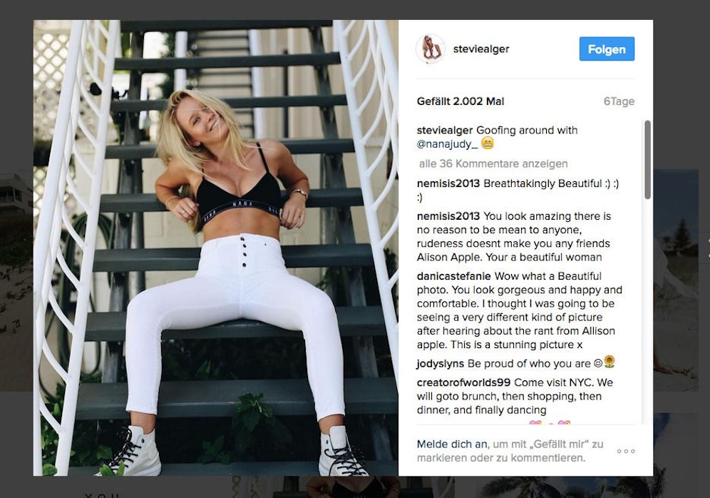 Sauer "da sitzt du mit gespreizten Beinen da." Wegen dieses harmlosen Instagram- Fotos stoppte eine Modekette nun ihren Werbedeal mit Model Sevie Alger instagram.com/steviealger