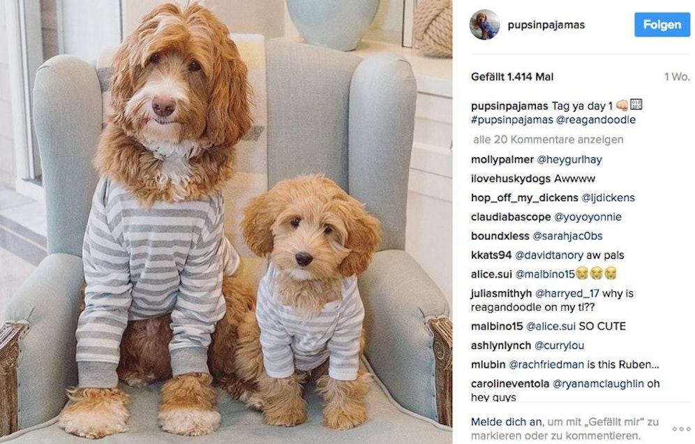 Bereit für die Pyjama-Party sind US-Labradoodle "Reagan" (li.) und sein tierischer Kumpel. Jetzt müssen nur noch die Mädels kommen! instagram.com/pupsinpajamas