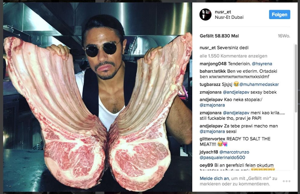 Fleischeslust. Nusret Gökce (34) aus Istanbul wurde mit einem 35-Sekunden-Video über Nacht zum Weltstar: In dem Clip schneidet der Fleischer Steaks zu, bestreut sie (mit einer kunstvollen Handbewegung) mit Salz - fast zehn Millionen User schauten zu! instagram.com/nusr_et