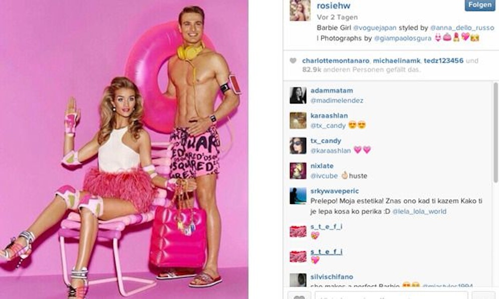 Groß. Als lebensgroße Barbie wurde Rosie Huntington-Whiteley von der Vogue Japan inszeniert. Stilecht in Roasarot mit einem Ken an der Seite. instagram.com/rosiehw