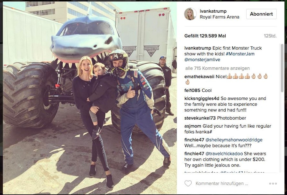 Monster-Jagd. Trump-Tochter Ivanka besuchte mit den Kids eine Monster-Truck-Show in Baltimore (USA) und hatte sichtlich Spaß. instagram.com/ivankatrump