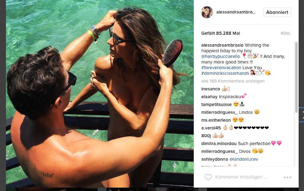 Hochfrisur. Supermodel Alessandra Ambrosio richtet Geburtstagsgrüße an ihren "Boy" Dominick Pucciarello aus - der ist nicht etwa ihr Freund, sondern ihr Hair Stylist. Ist ja auch ein haariger Job, so halbnackt und nur mit Bürste bewaffnet. instagram.com/alessandraambrosio