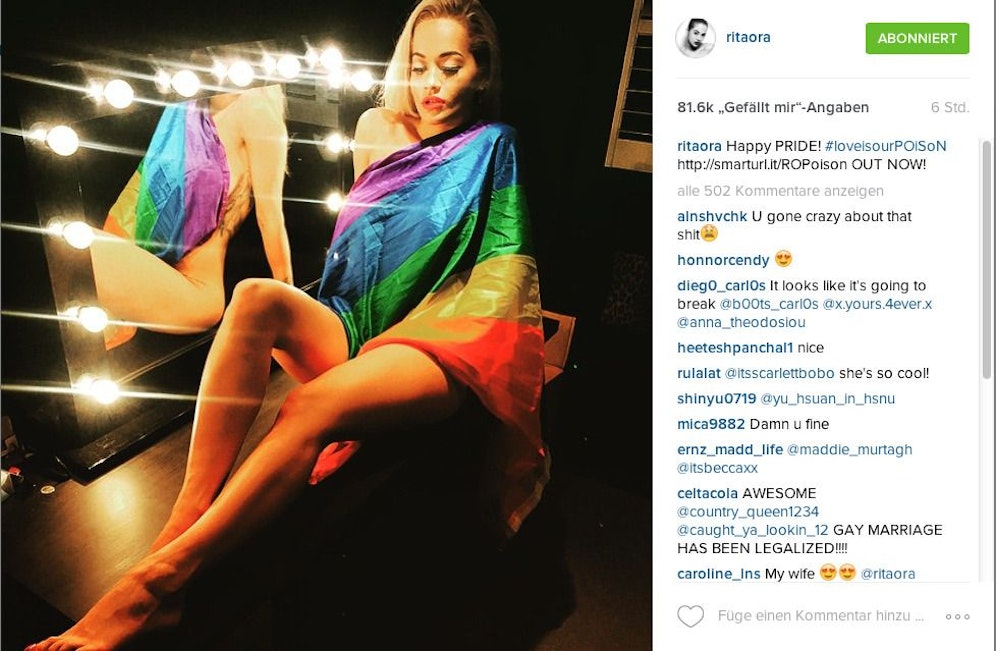 Solo: Auch Rita Ora freut sich über die Legalisierung der Homo-Ehe in den USA. Sie trat jetzt - nur in eine Regenbogenfahne gehüllt - in London auf, um ihr neuestes Werk "Poison" zu performen. instagram.com/ritaora