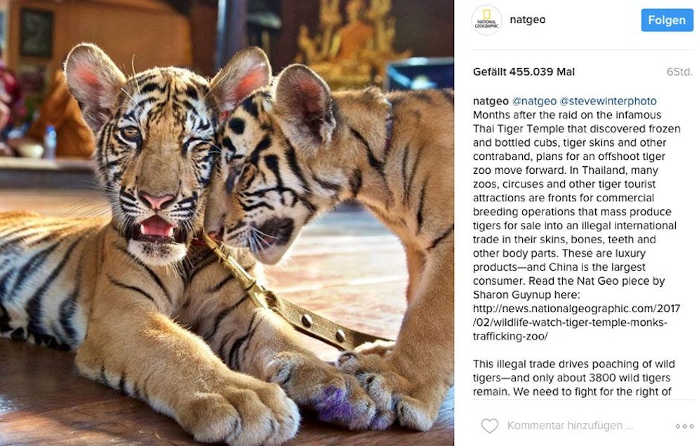 Happy End Nahe des umstrittenen "Tigertempels" in Thailand soll ein neuer Tigerzoo öffnen. Mönche hielten im Tempel früher 130 Raubkatzen als Touristenattraktion. Die Naturschutzbehörde ließ die Tiere abholen, weil es keine Genehmigung für deren Haltung gab. Jetzt finden die Raubkatzen, darunter auch diese beiden, ein neues Zuhause. instagram.com/natgeo/