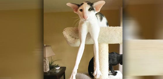 Bei der Fellnase handelt es sich um eine Orientalische Kurzhaarkatze. Besonders auffällig an der Rasse: die langgestreckten Gliedmaßen. Doch Teddy sticht trotzdem heraus. Denn seine Beine sind auch im Vergleich zu seinen Kollegen um einiges länger.