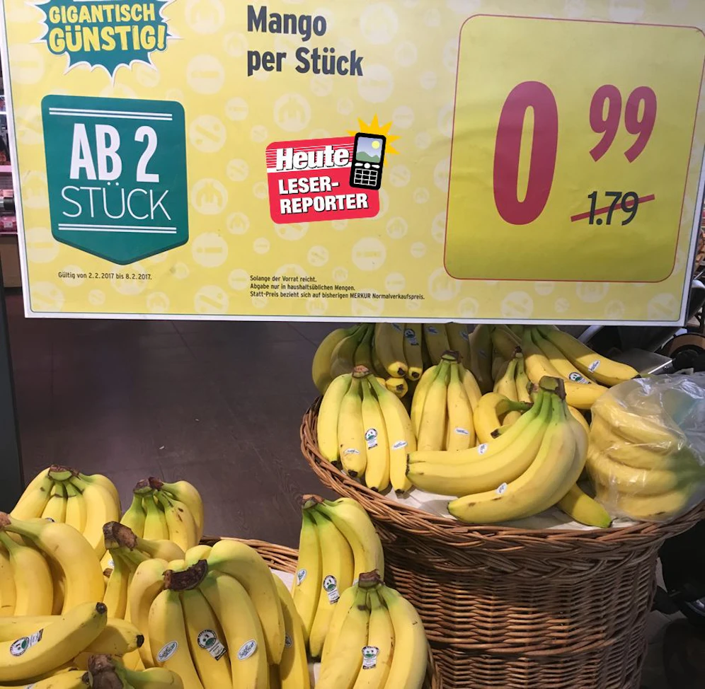 Hier passt das Angebots-Schild nicht mit den darunterliegenden Waren zusammen. Das Werbeschild für die "Mangos" dürfte sich über den Bananen-Korb verirrt haben. Jetzt wissen wir zwar, dass gerade Mangos im Angebot sind, was die Bananen kosten, ist auf dem Bild jedoch nicht ersichtlich.