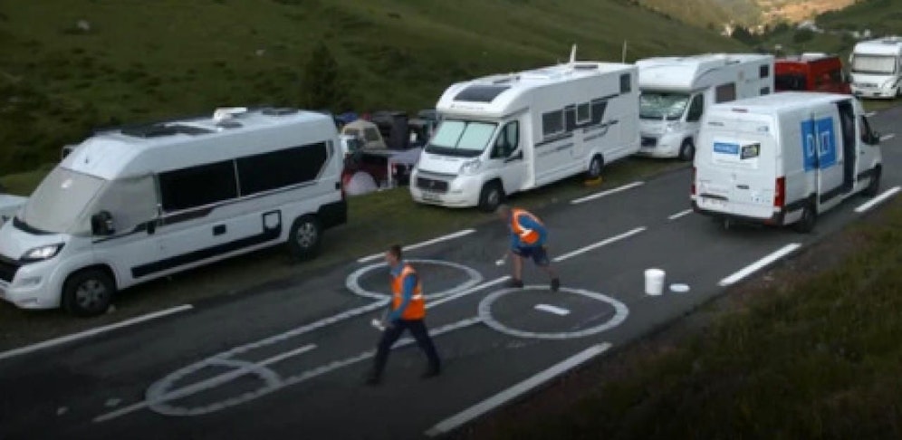 3.480 Kilometer lang ist die Strecke der Tour de France 2019. Zwei Männer fahren diese ab, ohne dass sie auch nur einmal das Fahrerfeld zu Gesicht bekommen. Sie haben eine ganz andere Aufgabe ausgefasst: Sie müssen dafür sorgen, dass die TV-Zuschauer nicht mit primitiven Zeichnungen auf der Straße eingedeckt werden. Die ASO, die Organisatoren der Tour de France, will das so.