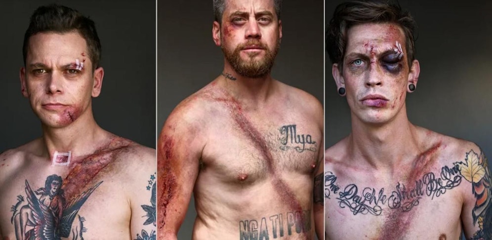 Im Rahmen einer neuseeländischen Aufklärungskampagne posieren jetzt Männer, die dank Gurt schwere Autounfälle überlebten. Ihre Verletzungen wurden von Maskenbildnern nachgestellt.