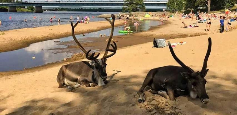 Bei dieser Hitze haben nun zwei Rentiere den Strand in Rovaniemi besucht und ein Sonnenbad genossen. Ein Bild, das man nicht jeden Tag zu sehen bekommt. 28 Grad hatte es an diesem Tag in der Hauptstadt von Lappland.