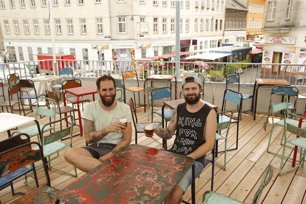 Weitere 50 Plätze laden drinnen zum Relaxen ein. "Wir haben nach einem Sommerlokal gesucht", sagt Vorarlberger Andreas, der gemeinsamt mit Waldviertler Manuel ab Freitag den Brunnenmarkt vert. Nicht nur der Stil des Lokals ist hip – mit Möbeln aus Indonesien. "Wir planen Events, gemeinsam mit dem restlichen Markt", kündigt Andreas an. Außerdem lassen die beiden auch ihre Herkunft einfließen. "Wir bieten Waldviertler Biobier an", sagt