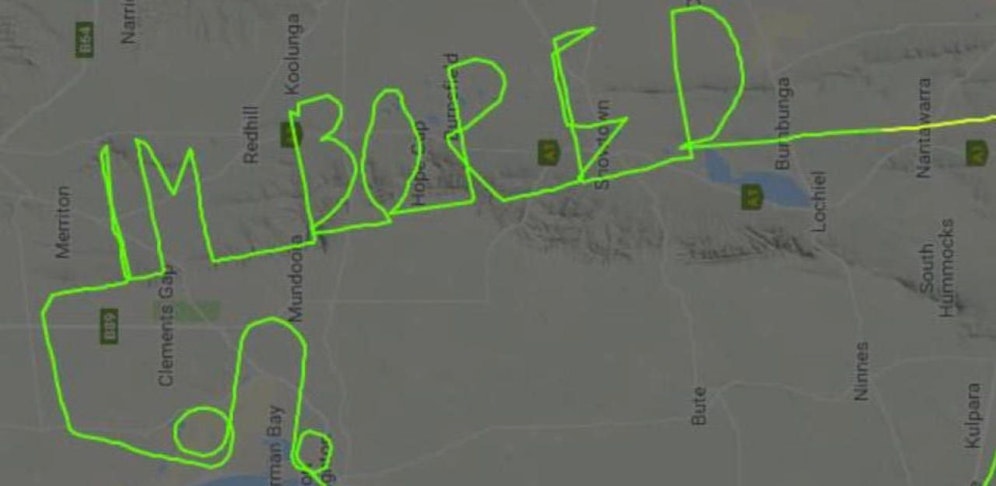 Auf den Radaren der Kontrolleure nördlich von Adelaide im Süden Australiens tauchte am Dienstag eine Botschaft auf: "I'm bored" ("Mir ist langweilig") stand in etwas gezackten Buchstaben geschrieben – siehe Video oben. Die Mitteilung stammte von einem Piloten, der einen neuen Flugmotor testen sollte.