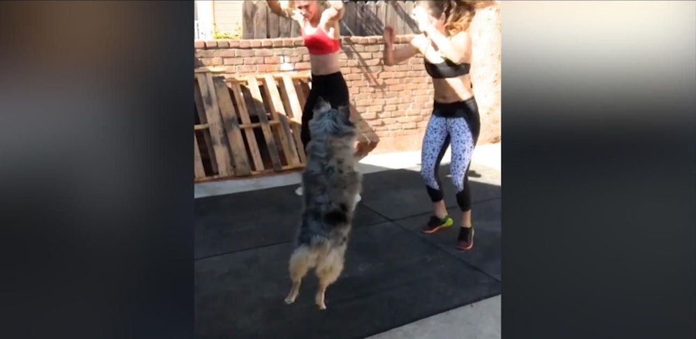 Beim Workout seines Frauchens hält dieser Australian Shepherd nicht nur wacker mit, er baut bei seinen Burpees sogar noch eine Extrarolle ein.