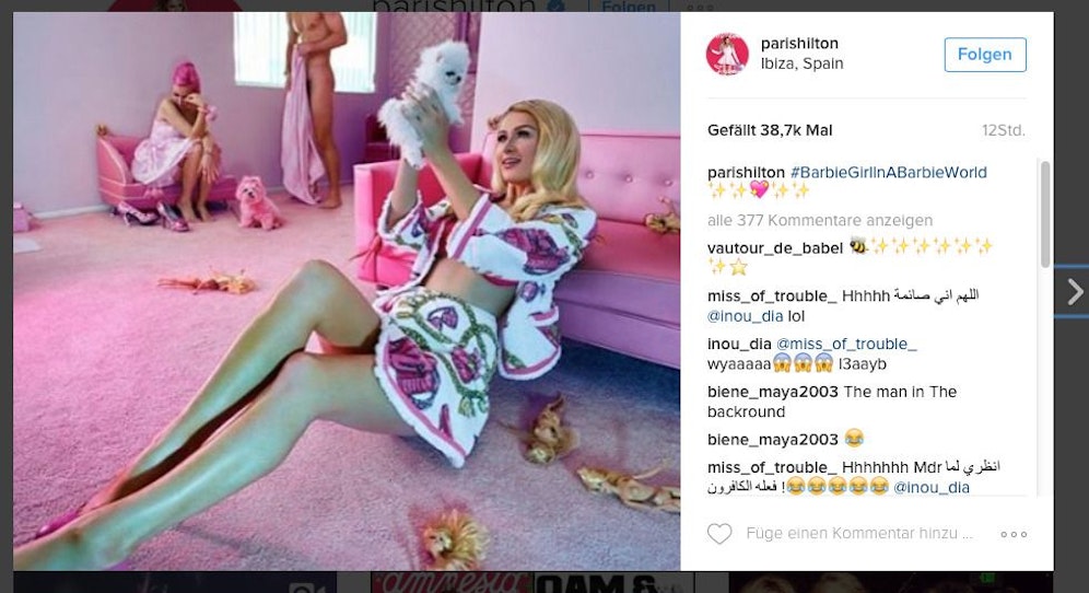 Jammer. postete dieses Foto, Kommentar: "BarbieGirl-InABarbieWorld". Lasziv rekelt sich die Hotel-Erbin auf dem Boden, im Hintergrund posiert ein nackter Mann. Nur im echten Leben ist kein Ken zu finden: Vom Österreicher Hans Thomas Gross hat sie sich getrennt. instagram.com/parishilton