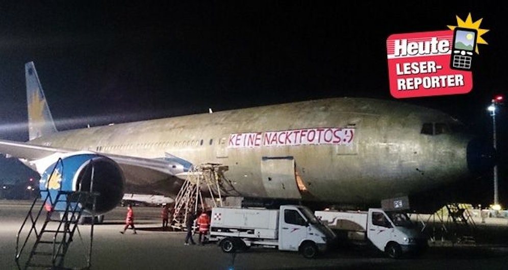 "Keine Nacktfotos ;-)" bittet die Besatzung ganz verschämt per Transparent an der Seite des Fliegers. Wir freuen uns, dass unser Leserreporter ganz frech trotzdem knipste.