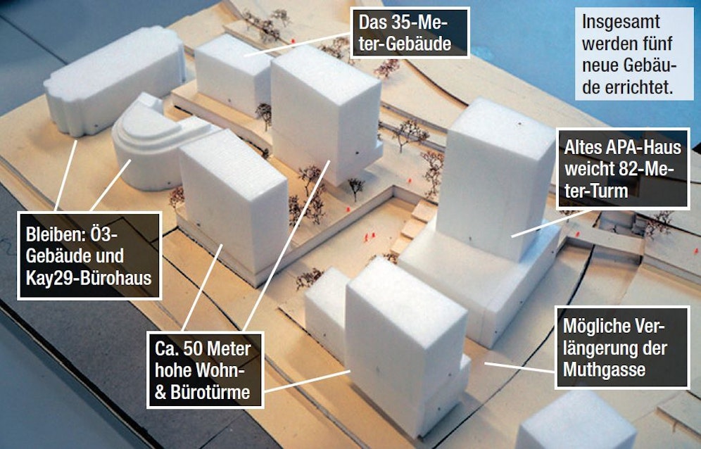 Neben den vier Türmen (50 bis 82 Meter hoch) soll auf dem 25.000 m großen Areal auch ein weiteres Gebäude mit 35 Metern Höhe gebaut werden. Vorgesehen sind ein Studentenheim, ein Hotel, Büros für Start-ups und Wohnungen (max. 50 %). Fix ist das Ganze allerdings noch nicht: "Es gibt noch die Flächenwidmung. Unsere Zustimmung und die der MA 21 fehlen noch", so Bezirkschef (ÖVP) zu "Heute".