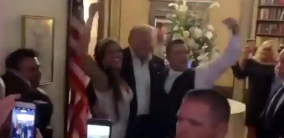Es folgte eine Umarmung für die Braut und wohlwollende Worte für den Bräutigam. Schließlich präsentierte sich Trump auch noch der restlichen Hochzeitsgesellschaft. Diese stürmte sofort auf ihn zu und begrüßte ihn mit einem "USA, USA"-Gesang.