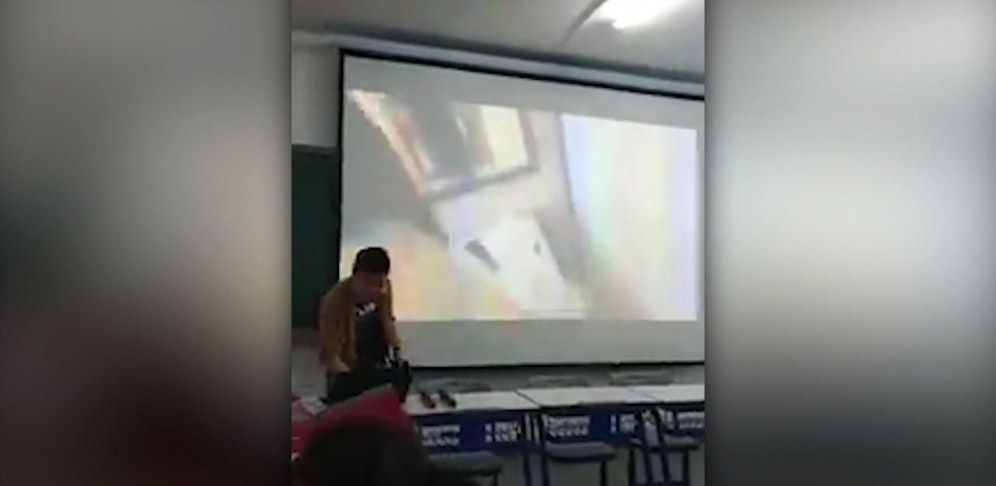 Ob der Film wohl zum Unterricht gehört? Wohl eher nicht. Denn der Dozent scheint sichtlich peinlich berührt über das Video zu sein, das auf der Leinwand abgespielt wird.