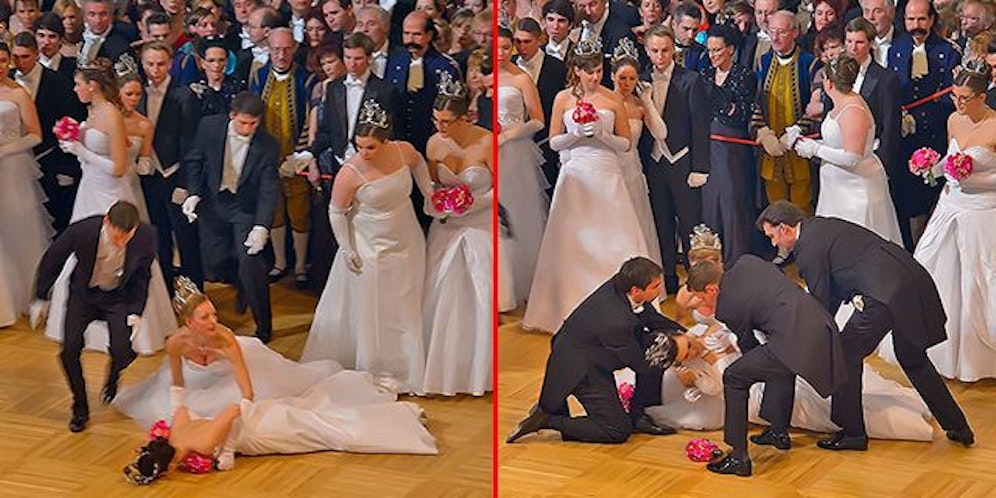 Direktor Dominique Meyer und einige Sanitäter kamen der jungen Frau sofort zur Hilfe, kurze Zeit später lächelte sie wieder. Geschockt waren jedoch kurzzeitig die Debütanten, die rund um die Zusammengebrochene aufgestellt waren. In der ersten Schrecksekunde wussten sie nicht, wie sie zu reagieren hatten und blieben erstarrt auf ihren Plätzen stehen. Nur ein Pärchen stürzte sofort zur Betroffenen und half.