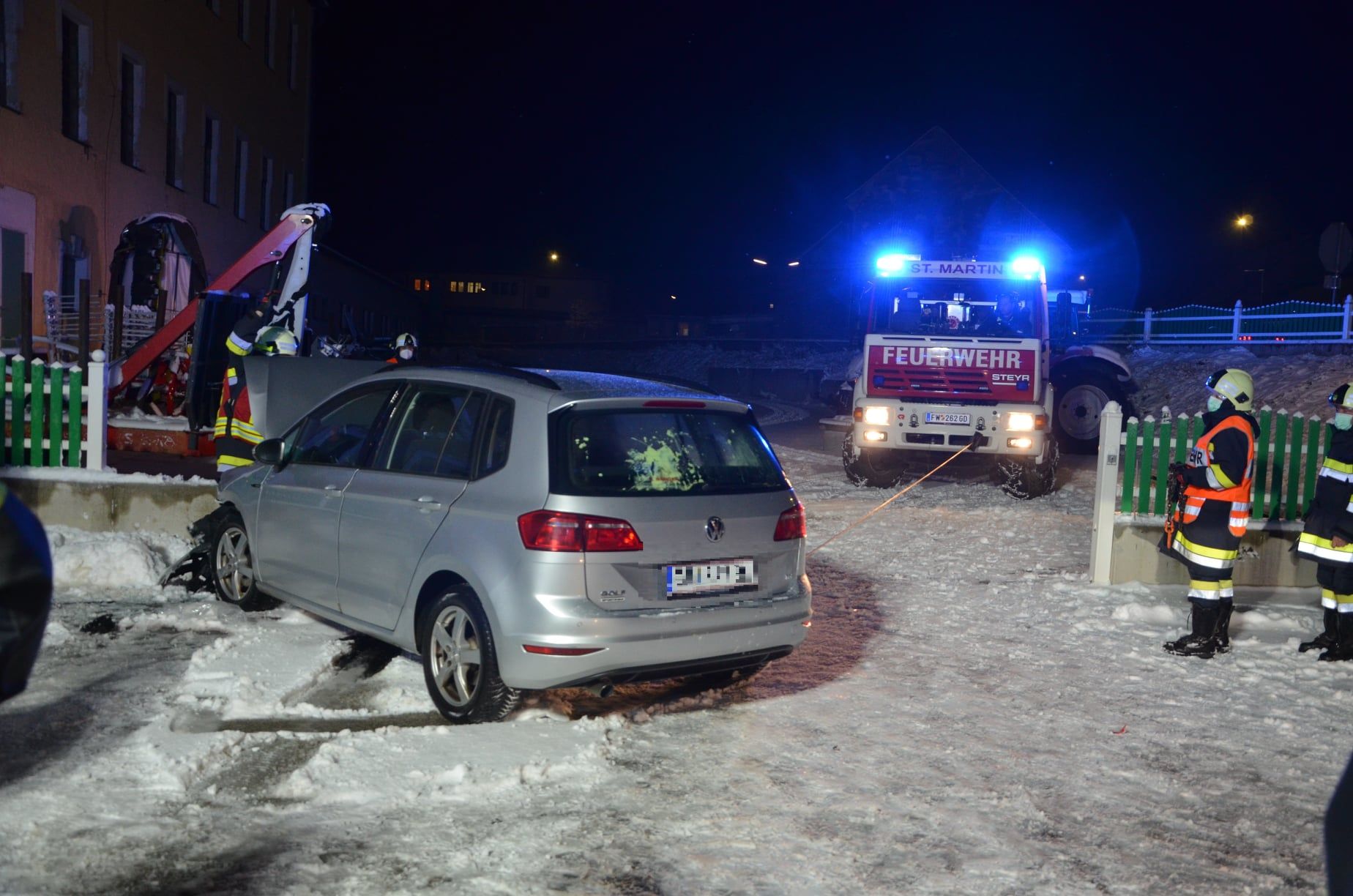 Drei Wehren mussten zu einem Unfall mit eingeklemmten Personen in die Zwettlerstraße 133 (Lagerhausgelände) in Weitra (Gmünd) ausrücken. Aus bisher unbekannter Ursache kam ein Pkw von der Straße ab und fuhr mit insgesamt drei Insassen frontal in eine Mauer.