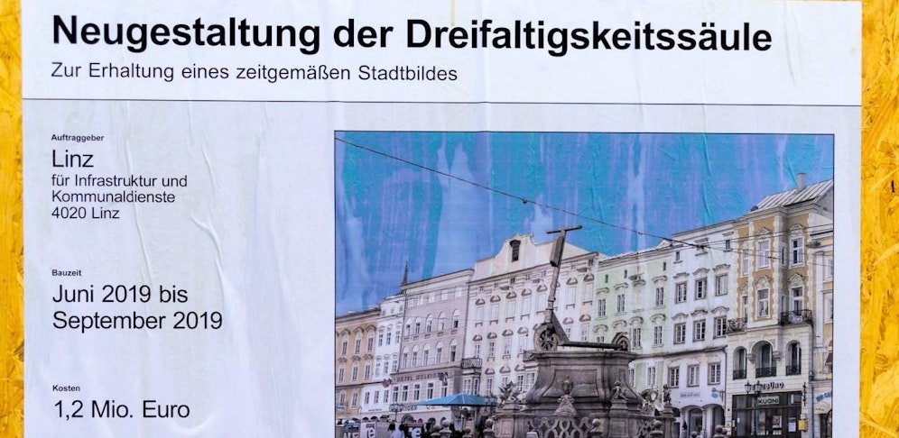 Einige Zettel am Baustellenzaun, der derzeit rund um die Säule aufgebaut ist, kündigen Unvorstellbares an. Unter dem Titel "Neugestaltung der Dreifaltigkeitssäule – zur Erhaltung eines zeitgemäßen Stadtbildes", ist auf den Zetteln ein Bild zu sehen, das so gar nichts mit der 300 Jahren alten Säule zu tun hat.
