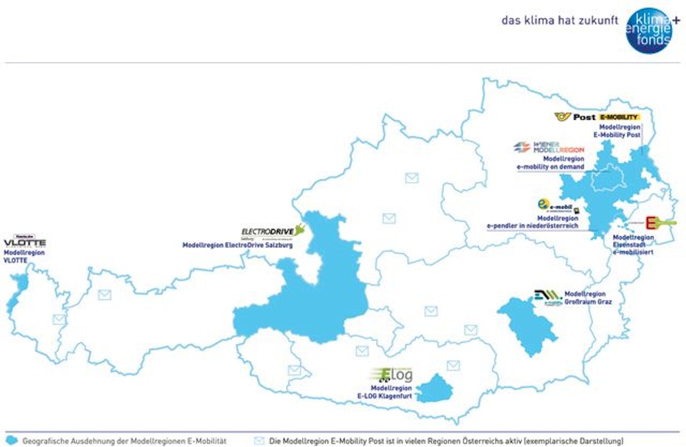 Derzeit gibt es acht Modellregionen in Österreich: Vlotte (Vorarlberg), ElectroDrive Salzburg, e-mobility on demand (Wien), Großraum Graz, Eisenstadt e-mobilisiert, e-pendler in Niederösterreich, E-LOG Klagenfurt und E-Mobility Post (Wien). Die Modellregionen unterscheiden sich in Bezug auf geografische Ausdehnung, Zielgruppen und Geschäftsmodellen. Durch Austausch und Vernetzung können so Synergien gehoben werden.