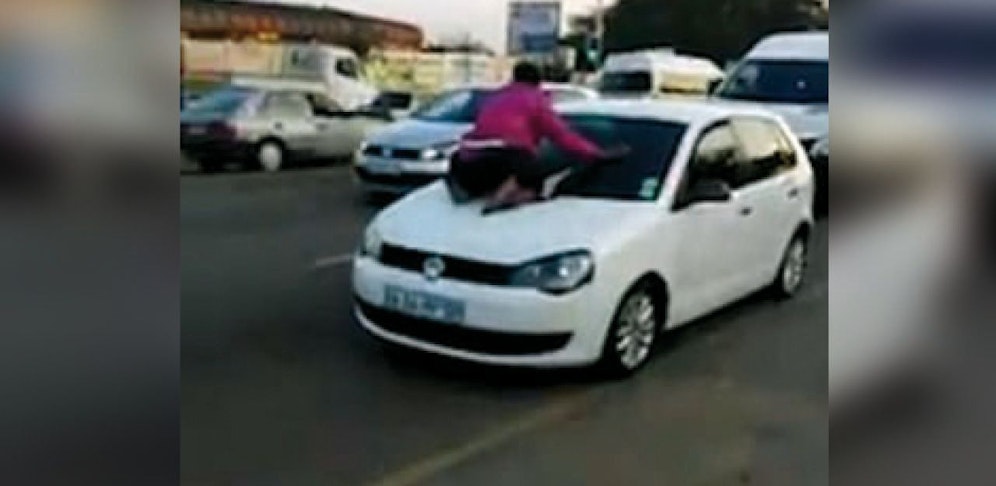 Eine Ehestreit in aller Öffentlichkeit endet in Südafrika damit, dass der Mann mit seiner Frau auf der Motorhaube davon fährt – während seine Geliebte daneben sitzt.