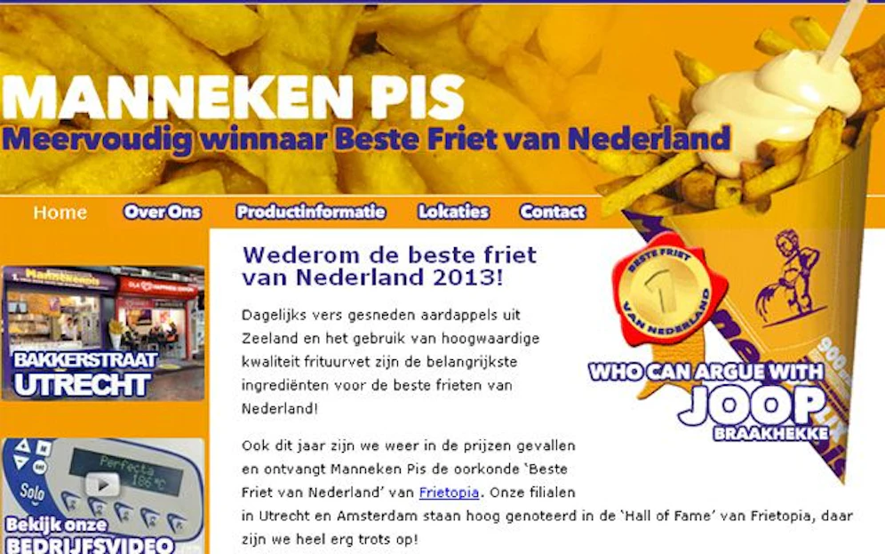 "Das ist reine Geschmackssache", sagte van Beek. "Wir sind Soßen-Spezialisten, wir probieren dauernd etwas Neues aus." Der Pommes frites-Verkäufer besitzt einen Imbissstand in Amsterdam und drei in Utrecht mit dem Namen Manneken Pis, dem Wahrzeichen von Brüssel.