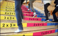 Ein weiterer Wunsch der Hortkinder war es, Klebefolie mit dem „kleinen 1x1" am Stiegenaufgang anzubringen. In einer gemeinsamen Sitzung der sieben Hortgruppen wurde die weitere Vorgehensweise abgestimmt. Die Kinder beschlossen, sich an Bildungsstadtrat Jürgen Czernohorszky (SPÖ) zu wenden – und der Wunsch der Kinder wurde erfüllt. Bei einem Besuch konnte sich der Stadtrat nun selbst ein Bild davon machen und gemeinsam mit den Kindern den neu gestalteten Stiegenaufgang „eröffnen".