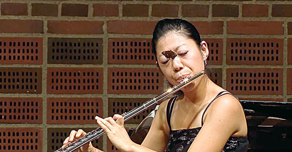 Yukie Ota behielt die Nerven: Die Japanerin spielte beim internationalen Wettkampf der Flötistinnen in Dänemark weiter, obwohl sich ein Schmetterling auf ihr Gesicht setzte.