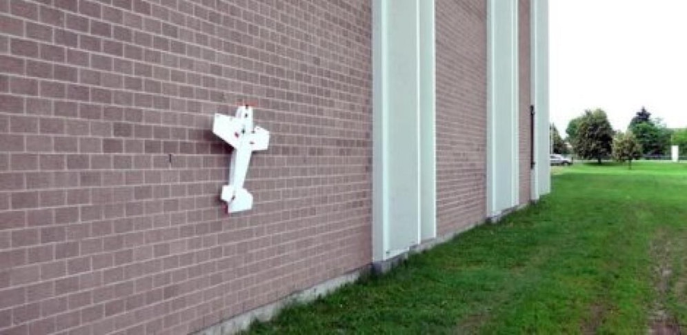 Fliegt die Drohne auf eine Wand zu, misst ein Sensor die Entfernung und richtet kurz vor dem Aufprall die Nase auf. Dadurch schwebt sie für einen Augenblick senkrecht in der Luft. Der Propeller an der Spitze wird gleichzeitig zum Helikopter-Rotor, damit die Drohne in Flugzeugform nicht abstürzt.