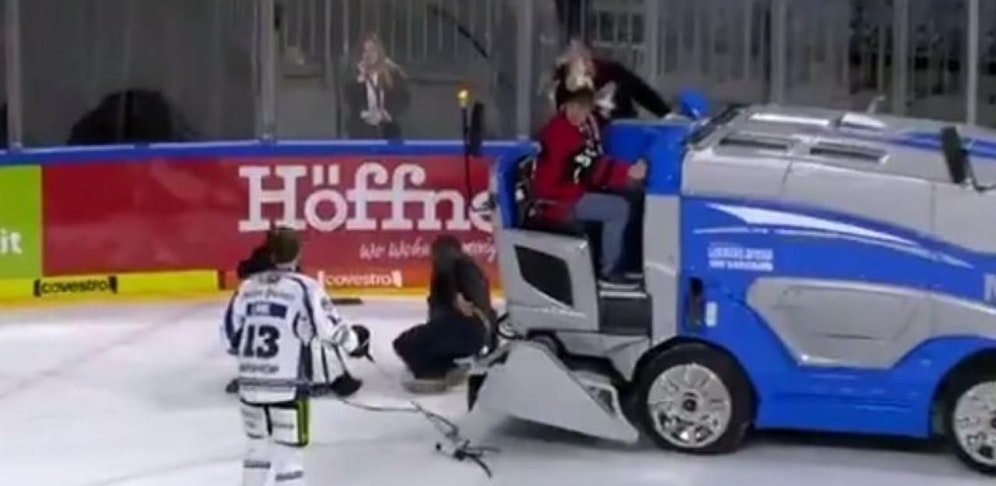 Tigers-Stürmer Stefan Loibl gibt gerade ein Live-TV-Interview und erklärt, dass er bei seinem Tor "mehr Glück als Verstand" hatte, als er plötzlich die Eismaschine erspäht, die auf ihn und die Fernsehleute zusteuert. Geistesgegenwärtig bringt sich der Eishockey-Crack aus der Gefahrenzone.
