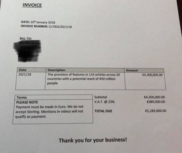 Nun stichelt der Ire nach: Er schickte der Youtuberin eine saftige Rechnung. Denn laut ihm hätte Ella Darby eine unglaubliche Medienpräsenz erhalten. Deshalb verlangt er nun eine Provision für "114 Artikel in 20 Ländern". Der Preis: 5.289.000 €!