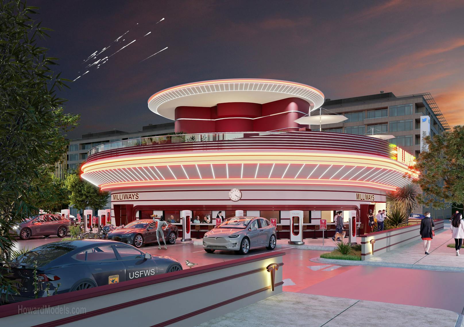 Ed Howard, ein Experte für architektonische Modelle, hat auf der Grundlage dieser Pläne Renderings erstellt, um uns eine bessere Vorstellung davon zu geben, wie das Tesla-Diner aussehen könnte: