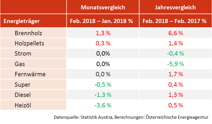 Österreichs Haushalte zahlten im Februar 2018 um 0,2 Prozent mehr für Energie als im gleichen Zeitraum des Vorjahres, zeigt der Energiepreisindex der Österreichischen Energieagentur. Die größten Preissteigerungen gab es bei Brennholz, Fernwärme, Pellets und Diesel. Gas war deutlich billiger. Im Vergleich zum Vormonat Jänner sanken die Haushaltsenergiepreise um 0,6 Prozent.