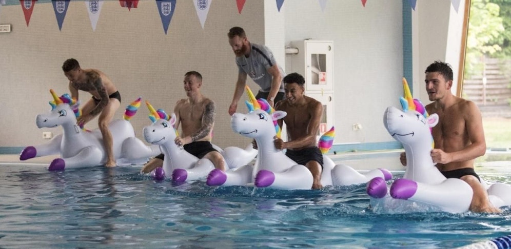 Wie feiert man den Auftakt-Sieg? Richtig, mit Einhorn-Rennen im Swimming-Pool. Bei England ist die Stimmung im Team nach dem 2:1-Sieg über Tunesien prächtig.