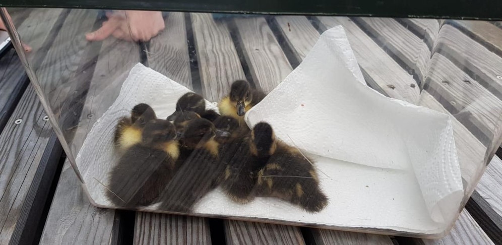 Die Wildtierhilfe holte die Küken und auch die Entenmama ab, brachte sie in Sicherheit. Sie werden nun bei einem Gewässer ausgesetzt. (T. Peterthalner/R. Colerus)