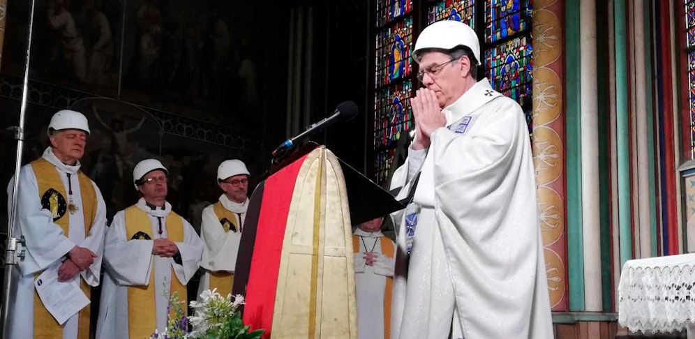 Exakt zwei Monate nach der Brandkatastrophe hielt Erzbischof Michel Aupetit die erste Messe in der beinahe von Flammen zerstörten Kathedrale – Schutzhelm inklusive.