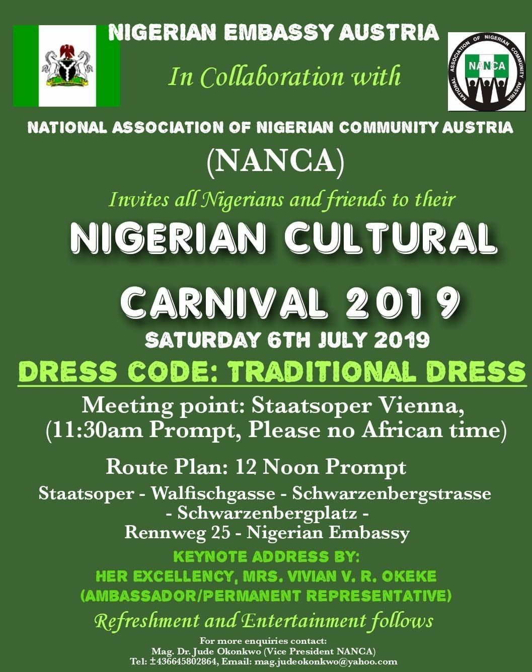 "Das wird ein tolles Fest!", erzählt die nigerianische Botschafterin Vivian Nwunaku Rose Okeke. "Erstmals wird ein bunter und fröhlicher Karneval mitten im Herzen von Wien stattfinden", ergänzt sie. Gewünscht werden traditionelle nigeriansche Kostüme, die am Samstagnachmittag von der Wiener Staatsoper über die Walfischgasse, Schwarzenbergplatz bis hin zum Rennweg 25, wo die nigerianische Botschaft ihren Sitz hat.