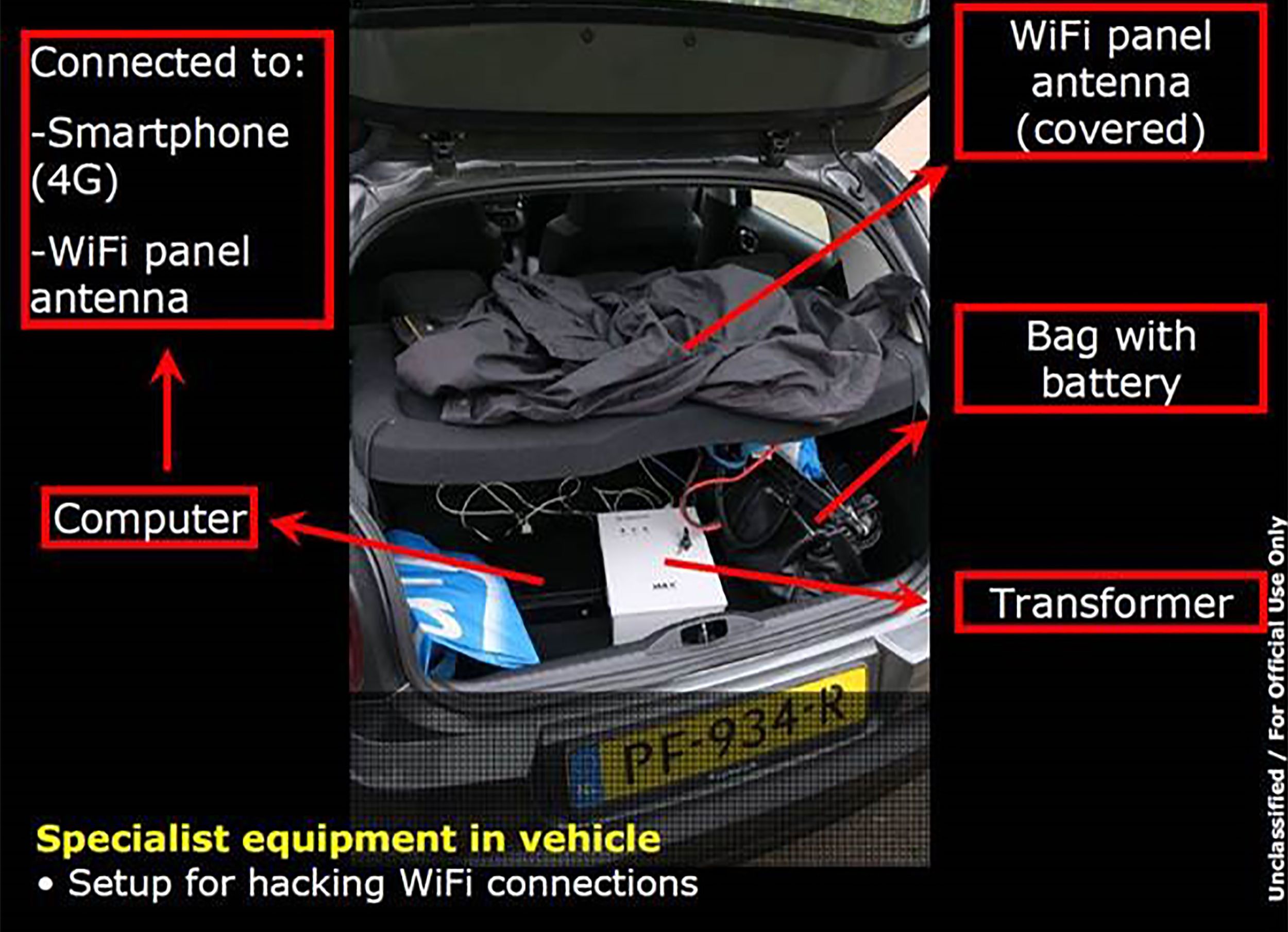 Sie hatten versucht, in einem Auto, das vor dem OPCW-Hauptquartier geparkt war, ein falsches WLAN-Netzwerk aufzuziehen. Dieses sollte sich als das WLAN der Organisation ausgeben, allerdings mit einem deutlich stärkeren Signal. So sollten sich mobile Geräte der OPCW-Mitarbeiter irrtümlicherweise mit dem gefälschten Netzwerk verbinden; die Agenten hätten dann so Passwörter und andere Daten abgreifen können.