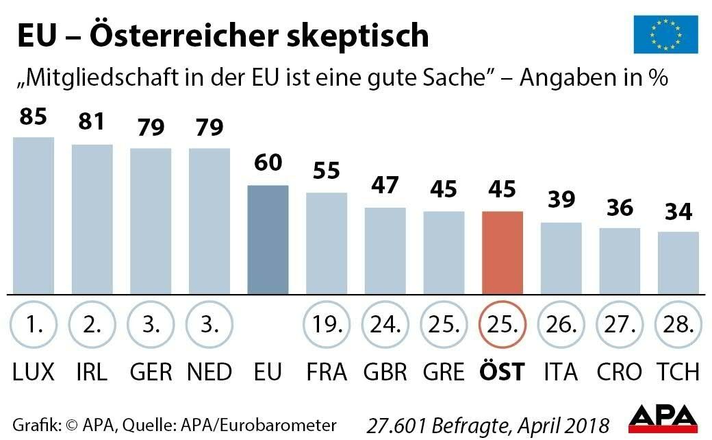 Eine klare Mehrheit von 60% der Europäer findet, dass die EU-Mitgliedschaft ihres Landes eine gute Sache ist. In Österreich halten 45% die EU-Mitgliedschaft für eine gute Sache, unverändert zur letzten Umfrage aus dem Jahr 2017.