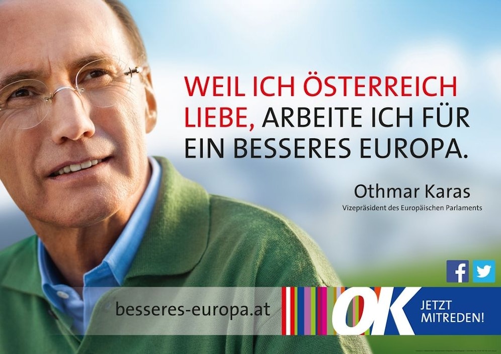 Die ersten Plakate zeigen Karas' Konterfei. "Weil ich Österreich liebe, arbeite ich für ein besseres Europa", lautet der Slogan, der mit dem Spruch "OK für Europa" unterlegt ist. Man wolle damit über die ÖVP hinaus Wähler ansprechen, erläuterte Blümel. Auf die parteiinterne Mobilisierung zielen dagegen die ÖVP-Plakate ab, die den Spruch "Ein besseres Europa. Für ein starkes Österreich." tragen und ohne Kandidatenfoto auskommen.