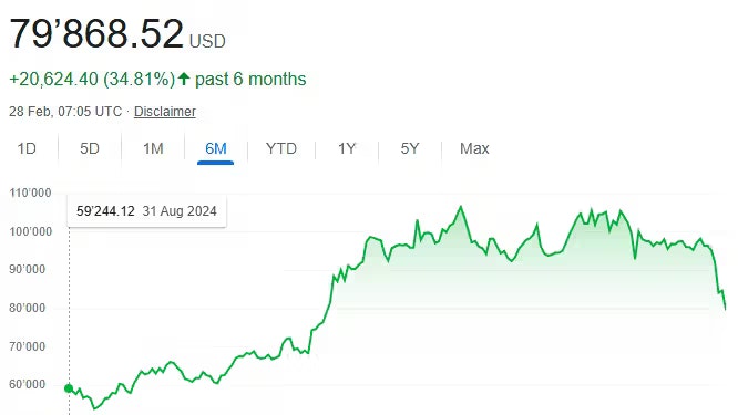 Der Bitcoin erreichte im Jänner, wenige Tage nach Trumps Inauguration, ein Allzeithoch von über 100.000 US-Dollar. Seither stürzte der Kurs jedoch ab – auf unter 80.000 Dollar. Dies ist nur noch knapp über dem Kurs, den der Bitcoin vor den US-Wahlen letztes Jahr innehatte.