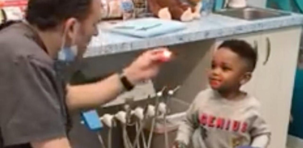 Auf einem Video ist zu sehen, wie ein kleiner Junge vor Glück und Überraschung quietscht, während Simchi neben dem großen Behandlungsstuhl kleine Plastiküberzieher für die Daumen aufleuchten lässt. Auch der Junge darf mal pusten - und zaubert so die Leuchtdaumen an den Händen des Arztes selbst wieder hervor.
