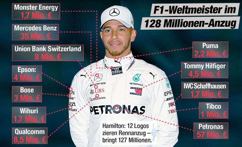 Am meisten zahlt Hauptsponsor Petronas mit 57 Millionen. Hamilton hat auch private Sponsoren am Rennoverall: Tommy Hilfiger, Puma, Bose und Monster Energy bringen 14 Extra-Millionen in sein Börserl.
