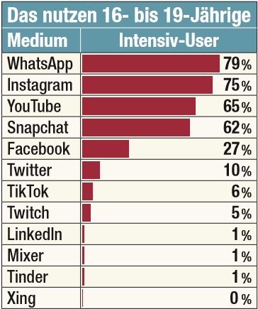 Unter 16- bis 19-Jährigen wird Facebook immer seltener genutzt. Die Spitzenplätze belegen allerdings zwei Plattformen, die dem Konzern angehören – WhatsApp und Instagram.