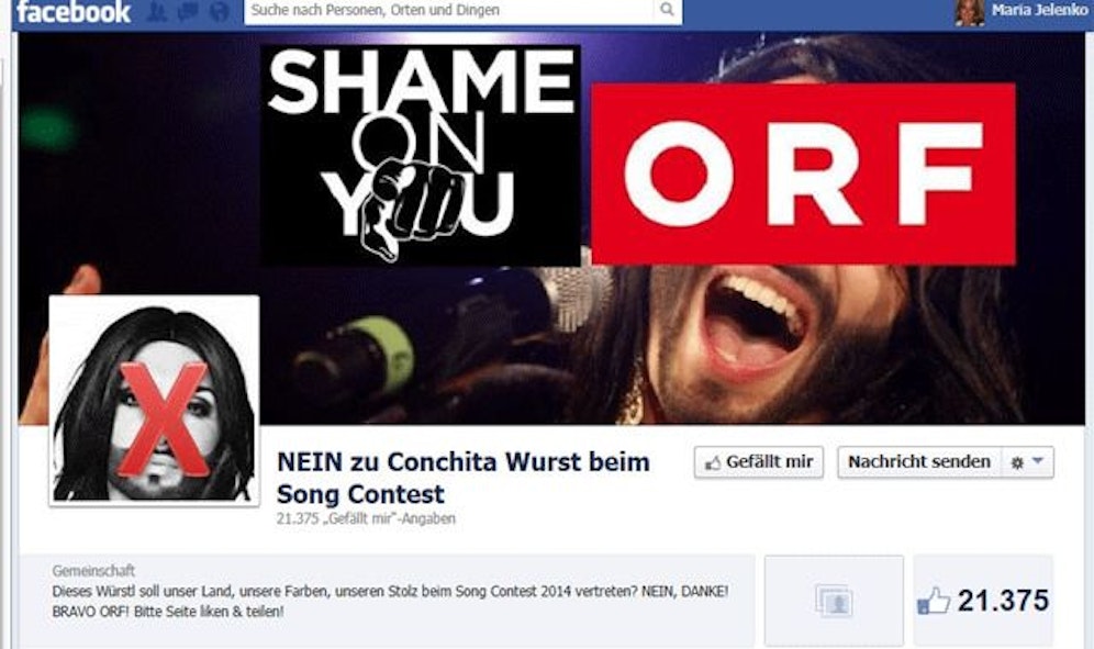 "Keiner will, dass Österreich von einer Transe vertreten wird"; "wieder ein Grund, dass sich Österreich in der EU lächerlich macht"; "kein Land hätte jemals so eine Figur zum Songcontest geschickt. Ich schäme mich". Das sind noch harmlose Postings auf der Facebook-Seite "Nein zu Conchita Wurst beim Song Contest", die nach drei Tagen schon über 20.000 Mitglieder zählt - inklusive Online-Petition. Selbst "Promis" wie Andrea Fendrich, Musiker Christian Becker und Co. sind dieser beigetreten und geben ihren Senf dazu.