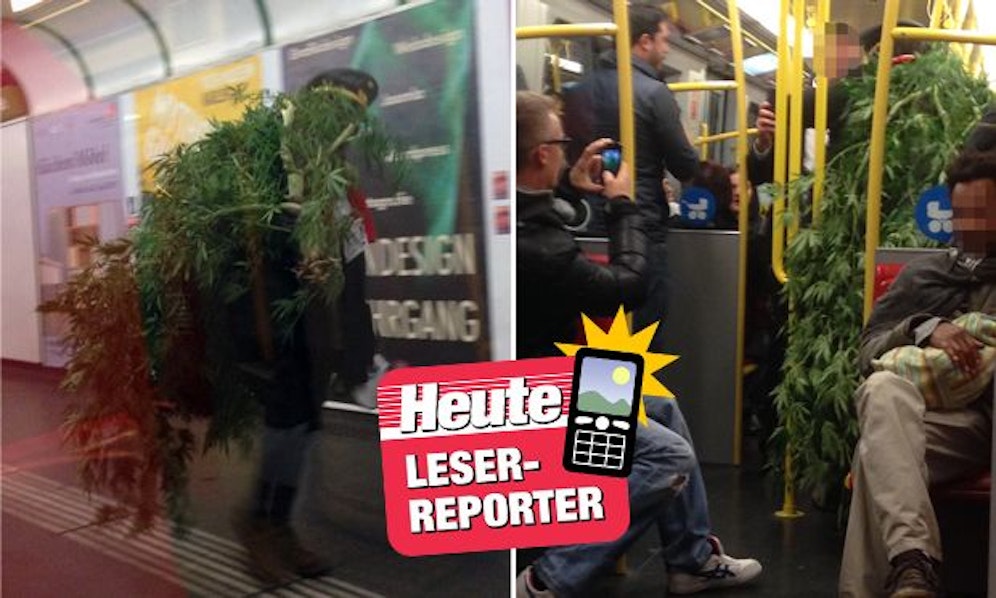 Solange über den wuchernden Blättern nur das Kapperl zu sehen war, hätte man annehmen können, ein echter Beamter fährt hier mit konfiszierter Ware in der U4. Beim näherem Hinschauen fielen allerdings die Beine auf, die unter dem wandelnden Gestrüpp hervorlugten. Da Beamte meist weder Leggings, noch Waldviertler-Patschen tragen, darf angenommen werden, dass ein "Hanfwanderer" seinen liebsten Besitz öffentlich ausführte.