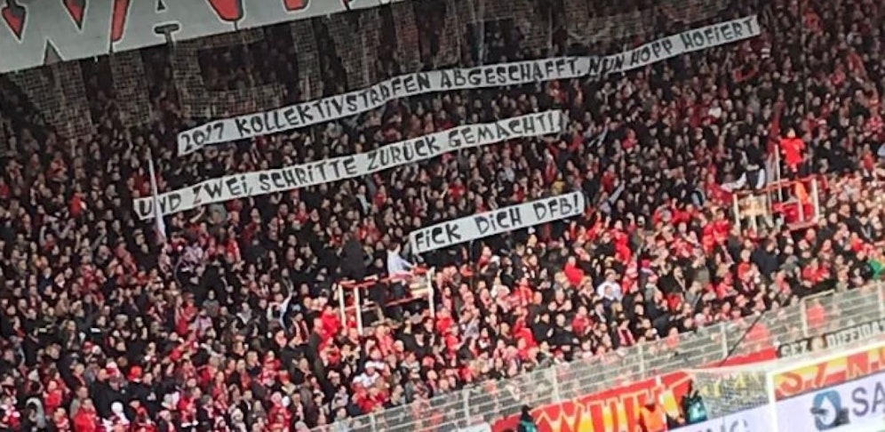 Einen Tag nach dem Eklat der Bayern-Fans beim 6:0 gegen Hoffenheim kommt es auf der Tribüne von Union Berlin zu ähnlichen Szenen. Auf einem Banner stand demnächst zu lesen: "2017 Kollektivstrafen abgeschafft, nun Hopp hofiert und zwei Schritte zurück gemacht - f*** dich DFB." Danach gab es ein weiteres Transparent, auf dem Hopp ähnlich wie am Samstag beleidigt wurde.